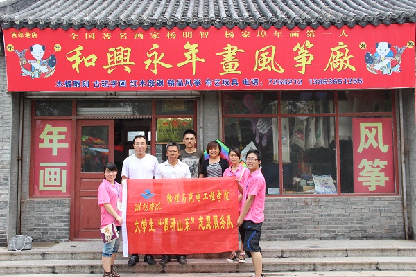 7月24日上午8:00,潍坊学院物理与光电工程学院大学生社会实践服务队正式启动本次“调研山东”社会实践活动。本次调研活动以“潍坊民俗文化传承与利用的综合调查”为课题,以民俗文化的保护、开发和利用为主题,应用相关理论为基础知识, 通过文献研究法、实地调查法、问卷调查法来对其现状进行分析、梳理,分别从科学管理规划原则、综合效益原则、民俗节庆文化品牌、宣传策略等方面入手,深入地了解潍坊地区民俗文化产业的开发中存在的问题从而从产业的研发、生产、销售到推广为潍坊各地的民俗文化提供一些可行的建议和意见,对潍坊地区民俗文化产业的开发利用和可持续发展做出一份贡献。本次调研活动的实地调查地点包括杨家埠、高密、风筝放飞场、风筝博物馆、十笏园、潍坊红木嵌银厂等,由学院团总支书记、辅导员办公室主任贺志波担任此次活动的团队指导老师。
