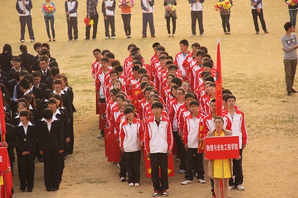 和煦的春风,吹落了一地粉红色的樱花。4月24号下午4点,在那个花香弥漫的樱花西路道上,有一支五颜六色的庞大的队伍,他们是19个二级学院的方队。他们不怕苦不怕累坚持训练了接近两周了,今天是他们第一次走进操场,走到主席台前,展示他们两个周来的训练成果,进行彩排。