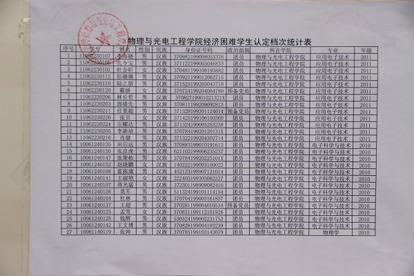 物理与光电工程学院高度重视贫困生的助学工作,每年都积极认真落实经济贫困生认定工作,争取把此项工作顺利有序的开展。在2013—2014学年度,为进一步贯彻落实学校的有关文件精神,认真做好物理与光电工程学院家庭经济困难学生的认定工作,公平、公正、合理地分配资助资源,切实保证各项资助政策和措施真正落实到家庭经济困难学生身上,《关于认真做好高等学校家庭经济困难学生认定工作的指导意见》,结合学院实际,物电学院紧紧围绕贫困生助学工作,严格执行文件精神及相关工作要求,求真求实,使该项工作得以有条不紊地持续深入推进。