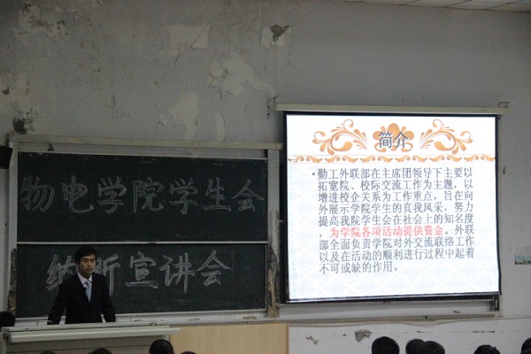 宣讲会中,大家首先共同观看了物电学院宣传片,对物电学院有了更加深入的了解。随后,物电学院学生会秘书长王进展对学生会进行了整体介绍和详细的部门说明,向同学们讲述了院学生会这个组织的性质、职责和发展状况等相关信息。并阐明了本次院学生会的纳新本着“公平、公正、公开”的原则,接受学院全体师生的监督,接着介绍了院学生会的纳新标准和各部门的职能,希望新生能够秉持全心全意为同学服务的态度加入学生会,在学生会中锻炼自己、提升自己、磨练自己的品质。接下来,各部长依次上台,通过前期精心准备的PPT展示,向2013级新生们介绍所负责部门的主要工作和纳新要求。不管是学习自律部的“学习为本,服务同学”的宗旨,勤工外联部的“适应社会 享受生活”,体育部的“来吧,加入我们”的热情;还是网络新闻部的对“能力、收获、温馨家文化”的诠释;或是量子志愿者的“真情”邀请;科技创新部“创造奇迹”的讲解,都给在座的同学们留下了深刻的印象。在宣讲的过程中,各部部长用幽默风趣又不失风范的语言和解说赢得了13级新生们一阵阵热烈的掌声,充分展现出物电学院学生会积极向上的良好的精神面貌和氛围。