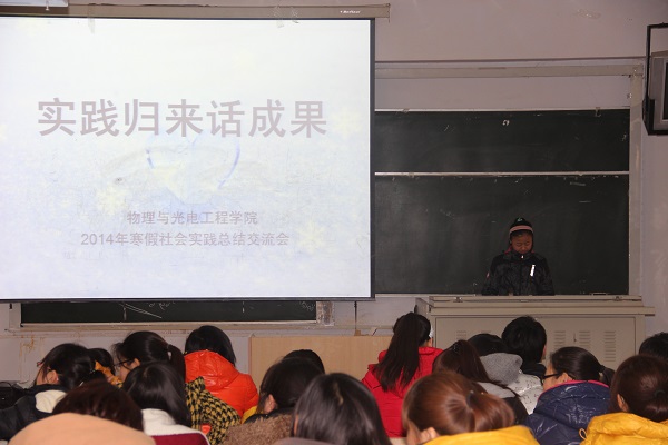 为了使大学生社会实践有更加良好的效果,物理与光电工程学院于2014年年3月9日在5210举办了2014年寒假社会实践交流会,学院团总支副书记张芳芳老师、学生会主席团和寒假社会实践各分队队员参加了此次交流会。本次交流会由12级郭小琰同学主持,整场交流会在一种活泼而又不失庄重的气氛中进行。