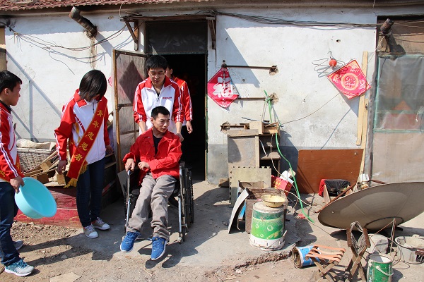 走进周连收家所在的胡同,两边的建筑物便形成了鲜明的对比,一边高楼林立、环境优美整洁,一番勃勃生机的景象;并一边确是矮屋密集、布置杂乱无章,让人感到萧条与凄凉。在邻居的指引下我们见到了周连收及他的家人,这个垃圾满地,尘土漫天的院子就是周连收生活了近10年的家,而他的卧室里连一件像样的家具都没有,房间里弥漫着一股发霉的味道,光线也不好。但周连收却没被窘迫的家境和残疾的身体击倒,一见到志愿者们就笑着打招呼,张老师则对周连收的状况表示了关心与慰问,限于语言上的障碍同学们同他的交流并不是很顺利,也因此引发了不少的笑料,小屋虽破却挡不住周连收的笑声连连。随后,一部分志愿者们将周连收推了出来,带他在院子和胡同中感受春日的明媚,与此同时,另一部分志愿者则留在卧室给周连收打扫房间。临近中午时,志愿者们与周连收合影留念,带队人员王进展表示以后会继续关注周连收的状况并给予帮助,在向周连收及其家人道别后,志愿者们便踏上了返程的路。