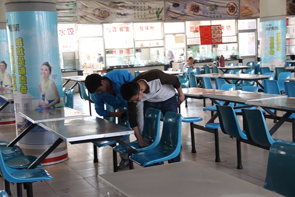 开展了明净教室活动后,同学们在餐厅就餐的时情况明显增多,但是餐厅的清洁人员任务大大加重,存在很多凳子不是很干净的问题,为了帮助同学们解决这一难题,物电学院志愿者服务队决定利用空余时间对餐厅的凳子进行清洁。下午两点,志愿者们在一餐门前集合,在进行了简单细致的分发工具以及分工后,大家就积极的开始打扫卫生了,此次活动中,各个志愿者都非常积极参加,分工合理,指挥得当,充分的体现了志愿者服务队的团结协作能力以及团队精神,虽然凳子比较多,有些地方比较难清理,但参与活动的同学们的心里却是轻快地,因为通过大家的辛苦劳动,餐厅变得更整洁起来了。看着自己的劳动成果,同学们的脸上是欣慰的笑。大家不怕脏不怕累,为了给同学们营造一个更好的就餐氛围,为了减轻保洁人员的工作负担,这些都是值得的。