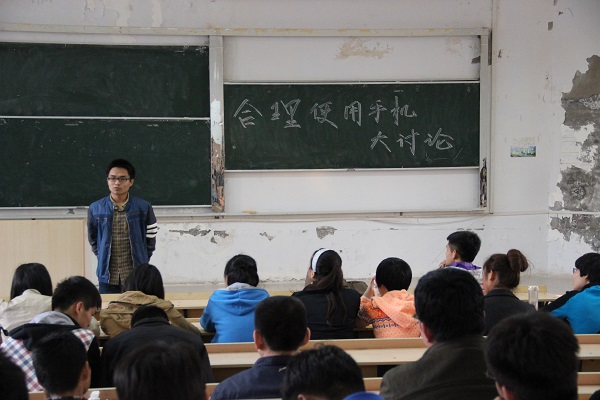 为积极响应近期学校正在开展的社会主义核心价值观教育主题活动,号召同学们合理使用手机以及坚持明净教室的行为。2014年4月1日星期二下午4点,物理与光电工程学院2012级全体同学在明正楼109室召开了主题班会,此次班会的主题是“合理使用手机大讨论”。辅导员隋老师参加此次班会。