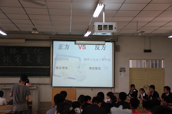 经过初赛大的激烈舌战,物电学院代表队顺利进入复赛阶段。在此期间物电学院代表队的四位队员从得知进入复赛开始就一直积极认真的做着准备,名人有言:机会总是垂青有准备的人。所以在此次复赛中物电学院的辩手们尽显风采。复赛现场,物电学院代表队和外国语代表队围绕“情理谁在先”这一问题展开了精彩的辩论。物电学院辩题观点为:理在情先。正方外国语学院代表对辩题观点为:情在理先。第一环节开篇立论,辩论双方都直奔主题,首先阐述了各自的观点中心所在。接下来是二三辩的公辩环节,双方都表现的十分精彩。言辞句句 咄 咄 逼人,其中双方质询时提出的问题都是一针见血,双方为此展开的激烈辩论,博得观众阵阵掌声。最精彩的是自由辩论,辩论过程中双方你不让我我不让你,比赛氛围紧张激烈,随着比赛的进行,赛场气氛逐渐进入高潮,双方辩手针锋相对,唇枪舌剑,你来我往。物电学院的辩手们既运用了大量的理论依据,引经据典﹑旁征博引,从多方面阐述了“理在情先”的原因。在辩论的过程中四位辩手的表现的都十分的自信,言辞犀利,却又不失风度,侃侃而谈,尽显物电学子的风采。