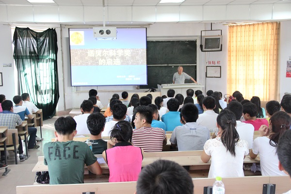 首先,逯院长为在场的老师和同学介绍了郭教授的基本情况。他介绍说道,郭奕玲教授是清华大学物理系教授,1931年出生于上海。曾任大庆石油学院、上海师范学院、华东地质学院、台湾东吴大学等10余所院校的兼职教授或做客教授以及《大学物理》编委,中国物理学会教学委员会委员等职务。著有《近代物理学发展中的著名实验》等30余部著作,退休后的20余年一直在清华大学开设选修课,并在上海、江苏、台湾等地巡回演讲。接下来演讲中郭教授讲到《诺贝尔科学奖的启迪》是清华大学开设的一门选修课,但却备受同学们的喜爱。开始这门课程为的是让同学们真正知道什么是科学?此次演讲郭教授主要围绕“成功的要素”这一课为大家做了讲解。郭教授介绍了许多位获得诺贝尔科学奖的中外著名伟大的物理学家们,例如,杨振宁、丁肇中、李政道、莱德曼、费曼等。郭教授声情并茂的介绍了他们的求学过程和执着于科学研究的成功所在。同时,还为大家讲解了X射线衍射的方法、细胞凋亡的研究等众多科学届的前沿问题。听了郭教授的精彩介绍在场的老师和同学们都备受鼓舞,现场响起阵阵掌声。郭教授还详细认真的回答了同学们提出的问题。