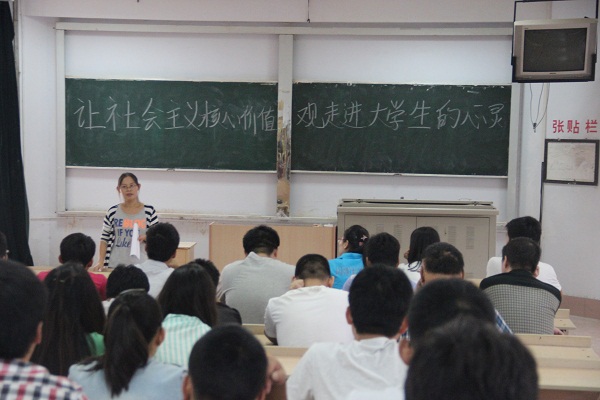 活动由各班级团支部书记主持,首先由物电学院团总支副书记张芳芳老师点明了此次以“学习社会主义核心价值观”主题团日活动的目的和意义。随后,以PPT形式把社会主义核心价值观的主要内容展现给同学们,同学们很认真的听讲学习。在学习完社会主义核心价值观的主要内容之后,同学们开始讨论和分享自己心中社会主义核心价值观。同学们从对社会主义核心价值观的认识、从身边发生的一些事情,从自我素质的提升等方面讨论如何更好的学习和践行社会主义核心价值观。通过讨论,同学一致认为,应努力把握大学时光,在学习文化专业课的同时,积极参与社会实践、开展校内外志愿活动,不虚度,不浪费,努力充实自己,为了更优秀的自己而奋斗,不断践行社会主义核心价值观。
