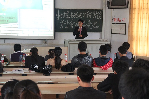 2014年10月16号下午2点,物理光电工程学院第十四届学生会部长级换届竞选大会在5210教室顺利展开。物电学院学院团总支副书记张芳芳老师、辅导员韩锴老师、黄小东老师出席了本次大会,担任本次竞选评委是物电学院第十四届学生会主席团全体成员。