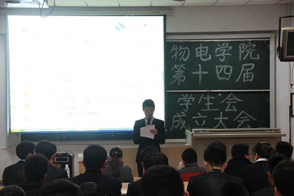 成立大会分为六项进行,第一项,全体成员起立,齐唱国歌,嘹亮的国歌声响彻教室。大会第二项,全体成员一起欣赏了一段由物电学院学生会精心制作的视频,充分展示了物电学院的活力与魅力。大会第三项,由秘书长王超宣读了新一届学生会成员名单。大会第四项,物电学院第十四届学生会主席王帅发言,并带领大家一起宣誓。主席的寄语使物电学院学生会全体成员更有信心和激情承担起他们的责任。大会第五项,大一新生代表的发言更让领导、嘉宾及学生会成员更加相信他们的实力。大会最后一项,由物电学院团总支副书记张芳芳老师作了精彩诚挚的总结,张老师对新一届学生会寄予了期望并提出了要求,张老师说到学生干部务必要记住三个牢记:⑴准确定位,明确职责;⑵严于律己,率先垂范;⑶公平、公正、公开原则。