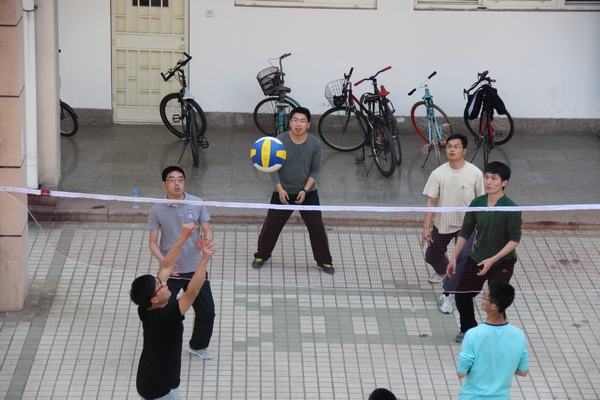 简单的架起两支木杆,套上运动网,简便的排球网就这样做成了,没有专业的队员,没有严格的规则,在这大院中,只有欢声笑语,和老师们一次次拍打球的声音。在这炎热的夏天,听着充满着活力与激情的声音,忍不住地就会被吸引过去,运动的队伍也由一开始的六七个人到了现在的十多个人。在这,没有了严格详细的数据统计,没有了用精密仪器去做的严谨的实验测量,在这,只有充满青春的激昂和热情。就算是练习,也都认真投入;就算是比赛,也充满欢声笑语。运动,让老师们走出实验室,锻炼身体、放松心情,以最佳的状态迎接新的工作;运动,让同学们更加青春洋溢、体魄强健、意志坚强,以更饱满的精神去面对各种挑战与困难。在这简单的运动中,老师也许没有教给学生们光电专业知识,但是,却言传身教,以这种积极向上的形式,丰富学生们的课余生活。简单的小运动,充满着大意义。