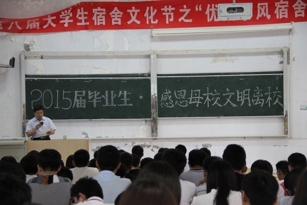 2015年6月5日下午4:30,物理与光电工程学院2015届毕业生在5109召开“感恩母校,文明离校”主题班会,班会由物电学院党总支副书记仲明礼主持,物电学院2015届全体毕业生参加。