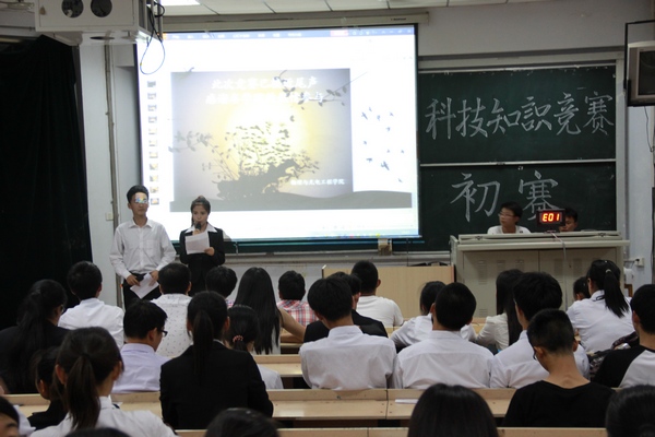比赛开始前,教室坐满了参赛队员和加油助威的观众,在主持人赵贵啸、陈菊萍的开场白后,比赛正式开始。比赛共包括三个环节。第一个环节是必答题,首先由第一队一号选手选题,3名队员按规定依次回答每一个问题,答对满分,答错不给分。按照规则,13支代表队依次选题、答题。物电学院代表队孙正林等3人3个题目全部答对。必答环节,13支代表队表现得都很出色。第二个环节是抢答题,这个环节最激烈也最残酷,需要精神高度集中,几轮抢答过后,分数渐渐拉大,抢答其实也是很有技巧的,抢的早不如抢的巧,有的代表队因为着急而抢答犯规,有的代表队因为紧张而没有抢答上。后面的观众看的也是热情高涨,不断地鼓掌加油。物电代表队反应迅速,抢答了很多题目,分数不断增加。第三个环节是论述题,各队派代表从13份试题中选择一份,进行口述回答,评委根据回答情况酌情打分。这个环节很考验参赛选手的心理素质和答辩能力。三个环节结束,在等待分数计算期间,进行了现场互动,此环节由物电学院自律部部长李川主持,由李川出题,现场观众举手答题,举手最快的可以答题,答对有奖品,这个环节,把现场气氛完全调动起来,也对普及科技知识起到了促进作用。成绩计算完毕,初赛的成绩当场公布,最后,物电学院等8支代表队以优异的成绩顺利晋级决赛。