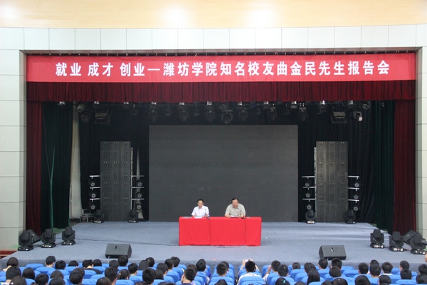 2015年6月16日下午3时,在潍坊学院图书馆报告厅,潍坊鑫源金店有限公司董事长、物理与光电工程学院82级校友曲金民先生在此举行题为《就业 成才 创业》的报告会,表达了曲金民先生对母校师生学习、就业、成才、成人等方面的关怀。报告会由潍坊学院副院长冯滨鲁主持,各二级学院、书院辅导员和学生参加了此次报告会。