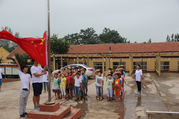 2015年7月21日,潍坊学院物理与光电工程学院“圆梦教育”社会实践队到达茹家庄小学的第六天,今天早上8点,举行了庄严的升国旗仪式,实践服务队全体成员和全体学生参加了此次升国旗仪式。