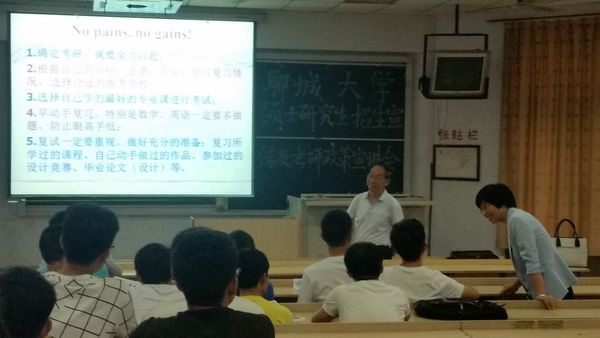 临近考研预报名,为了让同学们了解更多学校的考研政策,增加考研信心,2015年9月22日下午4点30分,在5210召开研究生招生宣传及考研政策的宣讲会,此次宣讲会由聊城大学物理科学与信息工程学院副院长葛广英、硕士生导师牟娟主讲。