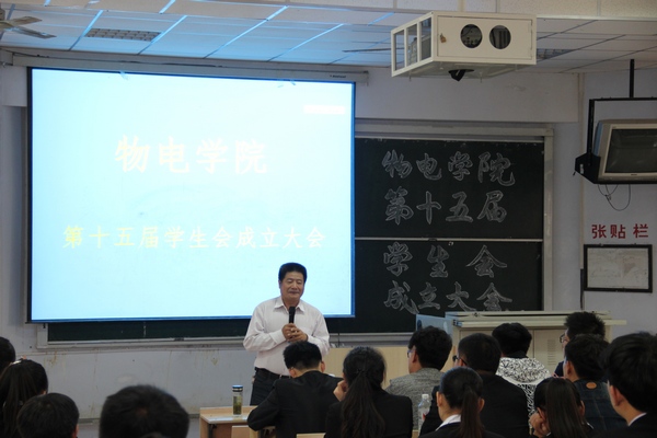 大会第一项,奏唱国歌,全体起立,庄严肃穆的地演唱国歌。大会第二项,各方面代表进行发言。首先由物电学院学生会主席阮世豪代表第十五届学生会全体成员发言,详细地阐述了自己对学生会的规划以及所要完成的目标,相信在他的带领下,物电学院学生会将更上一层楼。接下来由物电学院学生会秘书长王璐为大家宣读第十五届学生会成员名单,之后,新一届学生会干事代表孙新做演讲发言,作为所有新干事的代表,她详细的表达出自己心中对学生会的热爱和奉献学生会的决心,有了他们的加入,物电学院学生会又将是一番新气象。大会第三项,学生会主席阮世豪带领所有学生会成员宣誓,承诺未来自己对学生会全身心奉献。在成立大会的最后,物电学院院长逯怀新教授对新一届学生会提出殷切希望,从做人做事,到读书学习,逯院长将自己的经验经历以及人生感悟,细致的表达出来,让大家更好的去面对今后的大学生活和人生道路,相信听取逯院长的一番话,所有学生将更加清楚自己该怎样去度过大学生活。