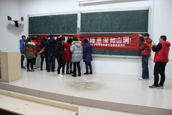为了表达对老师的感激之情,在感恩节来临之际,物理与光电工程学院量子志愿者服务队特别举办了“心系物电,感恩老师”活动。2015年11月25日晚六点三十分,活动在5109教室如期举行。在物电学院学生会主席阮世豪、副主席李川及量子志愿者服务队队长侯国奇的带领下,量子志愿者的成员和大一的同学们积极参加了此次感恩节签名活动。