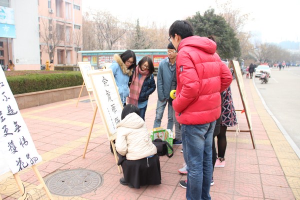 为了宣扬中华民族的感恩精神,传承中华民族的书画文化,2015年12月20日下午2点,物理与光电工程学院学生会宣传部于第二餐厅正门前举办了感恩书画展览活动。参与此次活动的有物电学院学生会宣传部全体成员及量子志愿者服务队部分成员。