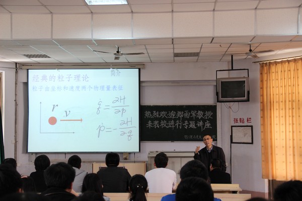 为了拓展大学生的视野,拓宽知识体系,2016年3月31日下午2点,物理与光电工程学院特别邀请了山东大学物理学院郑雨军教授在5210教室进行了一场题为《单分子体系相移门:非厄米量子体系的几何相位》的专题学术报告。此次报告由物电学院逯怀新教授主持,赵加强、曹连振、杨阳、李静等4位老师以及物电学院2013、2014级的部分同学参加了此次报告。