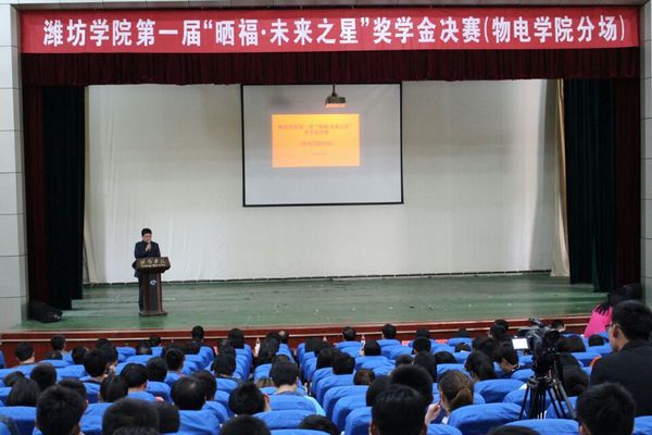 2016年4月14日14:30,潍坊学院第一届“晒福•未来之星”奖学金决赛(物理与光电工程学院分场)于图书馆报告厅正式举行。这是去年接受鑫源金店董事长、物理与光电工程学院1982级校友曲金民捐款100万元设立“晒福•未来之星”奖学金举办的第一届比赛。出席本次比赛的有潍坊学院副院长王清明、学生工作处处长李学军、学生工作处助学服务中心主任高历,潍坊鑫源金店有限公司代表王俊杰、曹希磊,各二级学院、书院辅办主任和学生代表,物电学院全体师生。担任本次比赛的评委有物电学院副院长黄宝歆教授、王春艳博士、赵加强博士、朱海玲博士、黄小东博士、张鲁筠博士、杨阳博士共7人。进入决赛的是经过投票初选和复赛选拔的2013级、2014级的10名优秀学子。