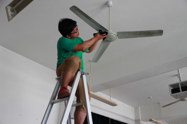 全体成员按时到达7号教学楼门口,事先与物业中心进行了对接,物电学院共负责13个教室。接下来,阮世豪首先将卫生打扫的注意事项跟大家讲清楚,重点擦拭灯管、灯罩、风扇、投影仪、黑板等教室高处的地方,同时强调,擦拭过程中一定注意安全。骄阳似火的天气并没有击退大家对清洁工作的热情,大家按照事先的分工,学生会各部门马上进入自己负责的教室,男生负责搬运桌椅、擦拭灯具、风扇,女生负责打扫卫生、收拾垃圾。分配好任务后,大家立即开始了工作。只见男生借助梯子用抹布一点一点地把风扇上厚厚的一层灰擦掉,女生紧紧的扶着梯子,保证同学的安全。剩下的人擦拭教室的黑板,最后,由两名男生清扫地面并拖干净。在学生会成员的默契配合下,教室很快变得焕然一新。最后,经过物业中心的负责人检查合格后,结束了此次“我为评估做贡献”教室清洁活动。
