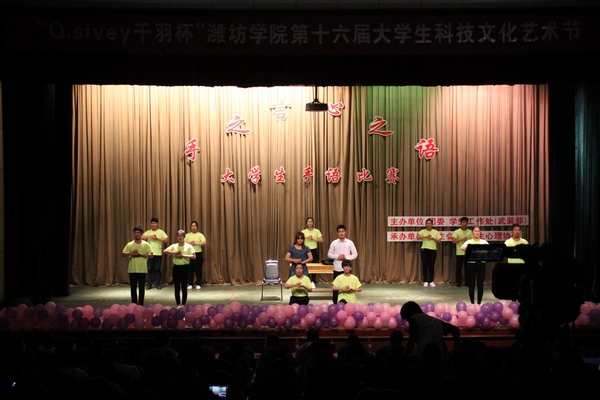 为了进一步丰富校园文化生活,增强校园文化氛围,2016年5月28日晚上7:00,潍坊学院第十六届大学生“手之言,心之语”手语比赛决赛在潍坊学院图书馆报告厅隆重举行。各二级学院的领导、老师和部分学生代表出席并观看了比赛,物理与光电工程学院代表队顺利通过初赛进入本次决赛。
