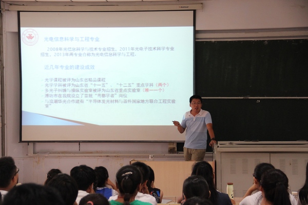 黄小东老师讲到光电信息科学与工程专业主要以光学研究为主,培养具有现代科学意识,理论基础扎实创新能力强,能够适应当代信息社会高速发展的应用型人才。黄老师向同学们介绍了山东省重点实验室——多光子纠缠与操纵实验室、被评为山东省精品课程和“十一五”、“十二五”重点学科的光学学科。黄老师希望同学们能在学好基础课程的同时,探索自己的兴趣爱好,多读书,多学习,丰富自己的大学生活。