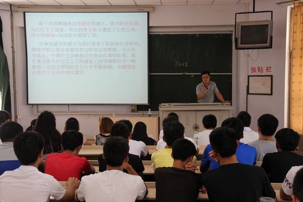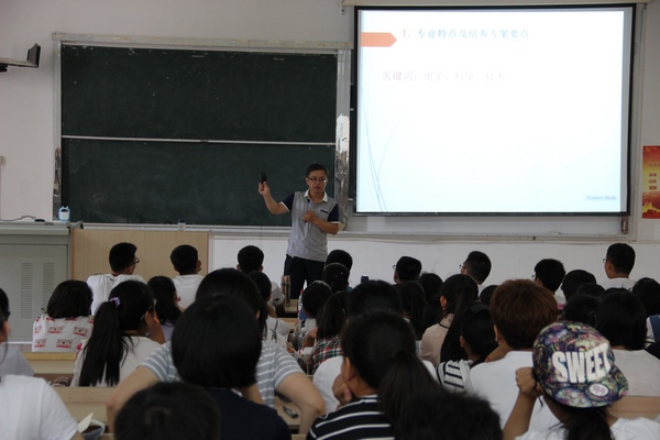 为了让2016级新生更快地融入大学生活,高效地学习相关专业知识,2016年9月12日下午在5210和5109教室,物理与光电工程学院组织了2016级新生专业认知指导会。此次专业认知指导会由物电学院副院长赵加强、电子技术教研室主任刘进忠、光电信息教研室主任黄小东、微电子专业讲师韩锴担任主讲。