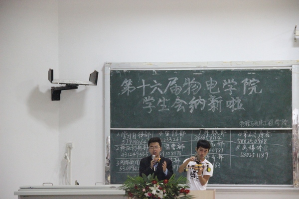 宣讲活动由秘书长吕高奇主持,首先为大家成为一名物电学子表示热烈欢迎,对物电学院第十六届学生会进行了简单的介绍,并就此次纳新宣讲的目的和程序向大家说明,把各部门的联系方式都写在黑板上。接下来,由各个部门派出代表上台宣讲。学习自律部代表从部门工作职能、工作回顾、对个人锻炼三方面介绍了学习自律部。科技创新部的部长杨筱首先向同学们展示了参加比赛获得的各项证书,还拿出他们做出的参赛作品展示给同学们,成功吸引了同学们的兴趣。网络新闻部与新媒体工作部一同宣讲,两位代表搭档,采用一问一答的形式,更具体地介绍了两个部门的工作内容和优势。宣传部、宿管部、女生部、外联部、文艺部、体育部、量子志愿者服务队也依次介绍了部门的工作内容、竞选要求、在部门中获得的锻炼等。各部门宣讲结束后,学生会主席王一鸣对此次宣讲进行了总结,并祝愿2016级新生可以在纳新竞选中有出色的表现。