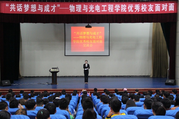 为庆祝潍坊学院65周年校庆,加强优秀毕业生与在校学生的交流学习,动员在校学生考研,物理与光电工程学院于2016年10月7日19:00在图书馆报告厅成功组织了“共话梦想与成才”物电学院优秀校友面对面交流会。此次交流会邀请了吉林大学在读博士生、物电学院2008级物理学专业孙兵,中国海洋大学在读博士生、物电学院2009级物理学专业张钦伟和青岛大学在读硕士生、物电学院2012级电子科学与技术专业王超。参加此次交流会的有物电学院党总支副书记贺志波、学生工作办公室主任张芳芳、辅导员李静以及物电学院2014、2015级全体学生。