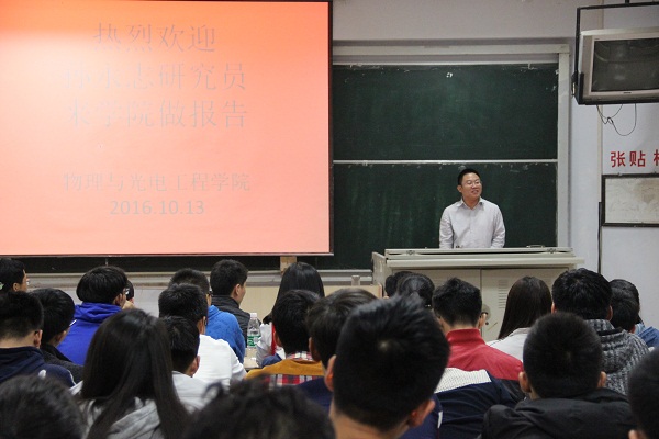 为庆祝潍坊学院65周年校庆,活跃校园学术氛围,在潍院校庆学术报告周中,物理与光电工程学院邀请东南大学孙永志研究员于2016年10月13日晚在5210教室作学术报告,此次学术报告的主题是《成长经历与科研精神》。前来参加此次学术报告的有物电学院院长李英德、副院长赵加强,物电学院教师张建心、樊心民、黄小东,计算机工程学院教师李厚荣,以及物电学院部分学生。