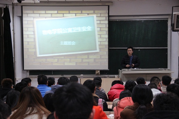 为进一步加强学生公寓安全建设,切实保障学生的人身和财产安全,教育引导广大学生提高安全防范和自我保护意识,倡导绿色文明健康的生活方式,营造良好的公寓环境,与此同时,为积极响应“宿舍安全月”主题活动的进行,物理与光电工程学院团总支副书记王振国开展了以“公寓卫生安全”为主题的班会,此次班会于2016年11月30日晚在明正楼5210教室召开,物电学院2014级全体学生参加。