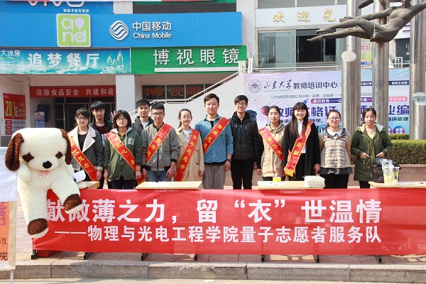 俗谚道:“赠人玫瑰,手留余香”,2017年3月16日至17日,物理与光电工程学院“量子”志愿者服务队在第二餐厅以及弘德书院,同时展开了一次名为“献微薄之力,留衣世温情”的志愿募捐活动,旨在帮助贫困群众,奉献爱心。