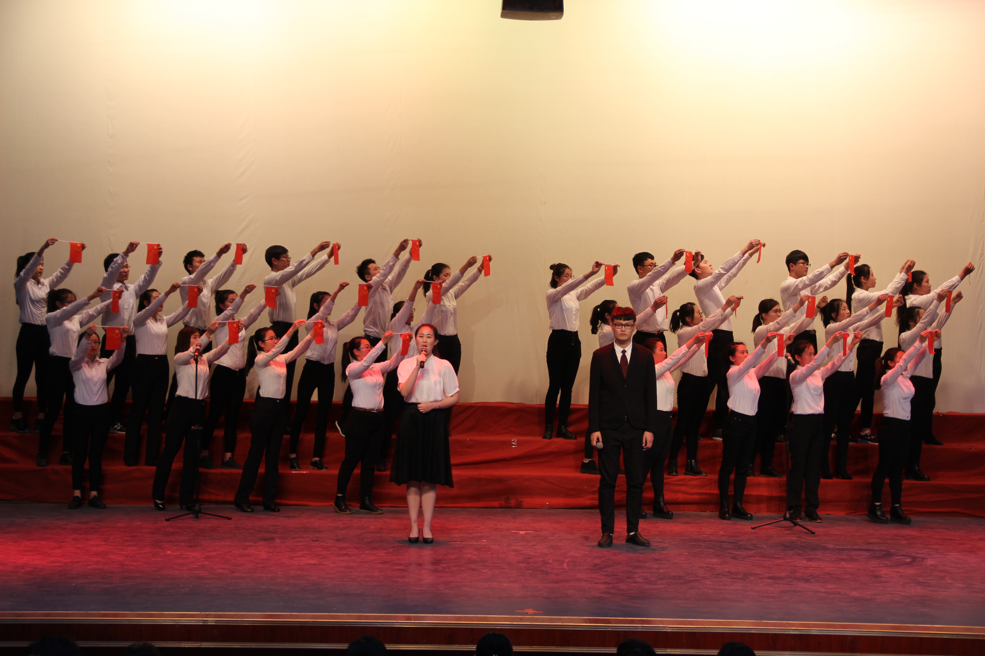 15时整,物电选手上场,只见物电选手临场不惧,迈着自信的步伐走上舞台。他们语气铿锵有力,情感激情澎湃,全身心的将自己融入到诗中。言语还不足以表达出那种身为中国人的骄傲,他们每人都挥舞着鲜红的五星红旗,用整齐划一的动作和激情洋溢的眼神表达出对五星红旗的敬意。物电选手用全部力气喊出最后一句“我骄傲,我是中国人”,余音绕梁,雷鸣般的掌声响起,身为中国人的骄傲情感深入到人们的内心。
