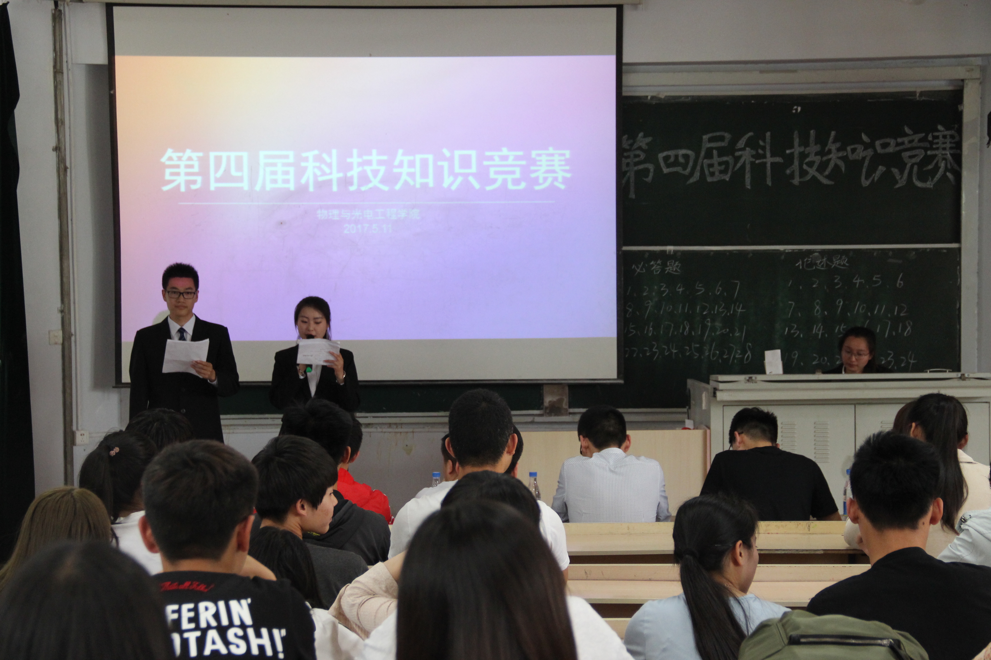 为深入学习宣传贯彻党的十八届三中、四中、五中、六中全会精神和习近平总书记系列重要讲话精神,培育和践行社会主义核心价值观,引导广大青年学生弘扬中华优秀传统文化,丰富校园文化生活,促进广大青年学生健康成长,物理与光电工程学院团总支特承办潍坊学院第十七届大学生科技文化艺术节第四届科技知识竞赛活动,本次活动于5月11日下午2时在明正楼5210教室隆重举行,牛继勇老师莅临现场主持本次活动,各系均派出代表队参加。