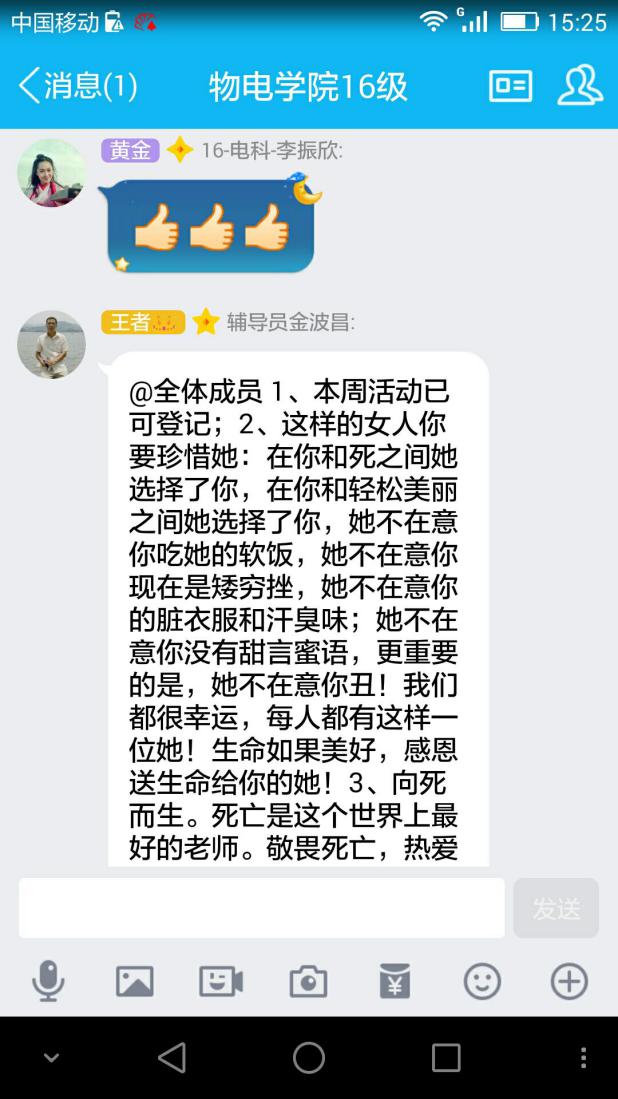各位同学纷纷在QQ群表达了自己对母亲的感情,有的搞笑,有的深情,有的不羁,不管内容如何,文笔如何,都是我们对母亲的感谢,对母亲的爱意。其中金波昌老师推荐的物理学专业2016级1班孙淑怡同学在“感恩母爱”一文中写到“母爱是最纯洁最无私的爱,母亲的眼里永远都是自己的孩子。她为儿女操劳一生,含辛茹苦的从不抱怨。缕缕的青丝变银发,满脸的皱纹刻画着岁月的痕迹。她们的手粗了,腰弯了;岁月无情,斑驳了谁的容颜。她们把青春给了儿女。平凡伟大的母爱是世界上最暖的亲情。无论时间怎样流转,岁月怎样变迁。在我们心目中,母亲是永远最美的。儿行千里母担忧,那浓浓的牵挂永远都是难以割舍的。母爱是天涯游子的最终归宿,是润泽儿心灵的一眼清泉,它伴随儿女的一生一世。丝丝缕缕绵绵长长的延伸。于是,在儿女的笑声中泪眼中便融入母爱的缠绵。”电子科学与技术2016级2班徐赵敏说,“我妈妈很勤劳,很善良,她是一个很要强的人,她很爱我,会担心我的安危,她一直嘱托我多吃水果蔬菜,少吃垃圾食品,妈妈告诉我要靠自己,要自强,要干好自己该干的事,告诉我做一件事,就做到最好。做什么事都要认真。如果我犯了错误,她还是会批评我的,一位慈爱又严厉的母亲。”光电信息科学与工程2016级肖月亮同学说:“我的母亲是一个坚强、仁慈、乐观的母亲,她是我最坚强的后盾。她教会我要坚强、勇敢,她是我生命中最感谢的人。”16级电子科学与技术专业亓羽寒用电话的通话记录来表达出对母亲的爱,爱不能只在口中说,还要在现实中去做。