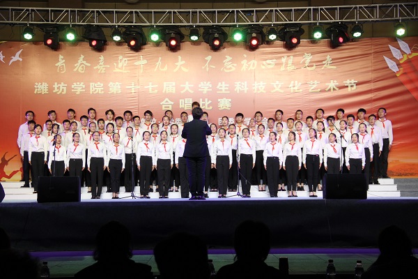 为了深入学习贯彻习近平总书记系列重要讲话精神,围绕学校中心工作,构建和谐活力校园,引导青年学生树立崇高理想,发奋成长成才,以良好的精神风貌迎接党的十九大和学校第三次党代会胜利召开。2017年5月25日,由潍坊学院党委宣传部、校团委主办,主题为“青春喜迎十九大,不忘初心跟党走”的大学生合唱比赛在行政楼北广场成功举办,潍坊学院副校长王清明作为嘉宾莅临比赛,出席此次比赛的评委有潍坊学院工会副主席初咏梅,音乐学院教研室主任解涛,音乐学院声乐专业教师(副教授)刘继鹏、郝建汇,特教幼教师范学院合唱指挥专业教师(副教授)张凤美。