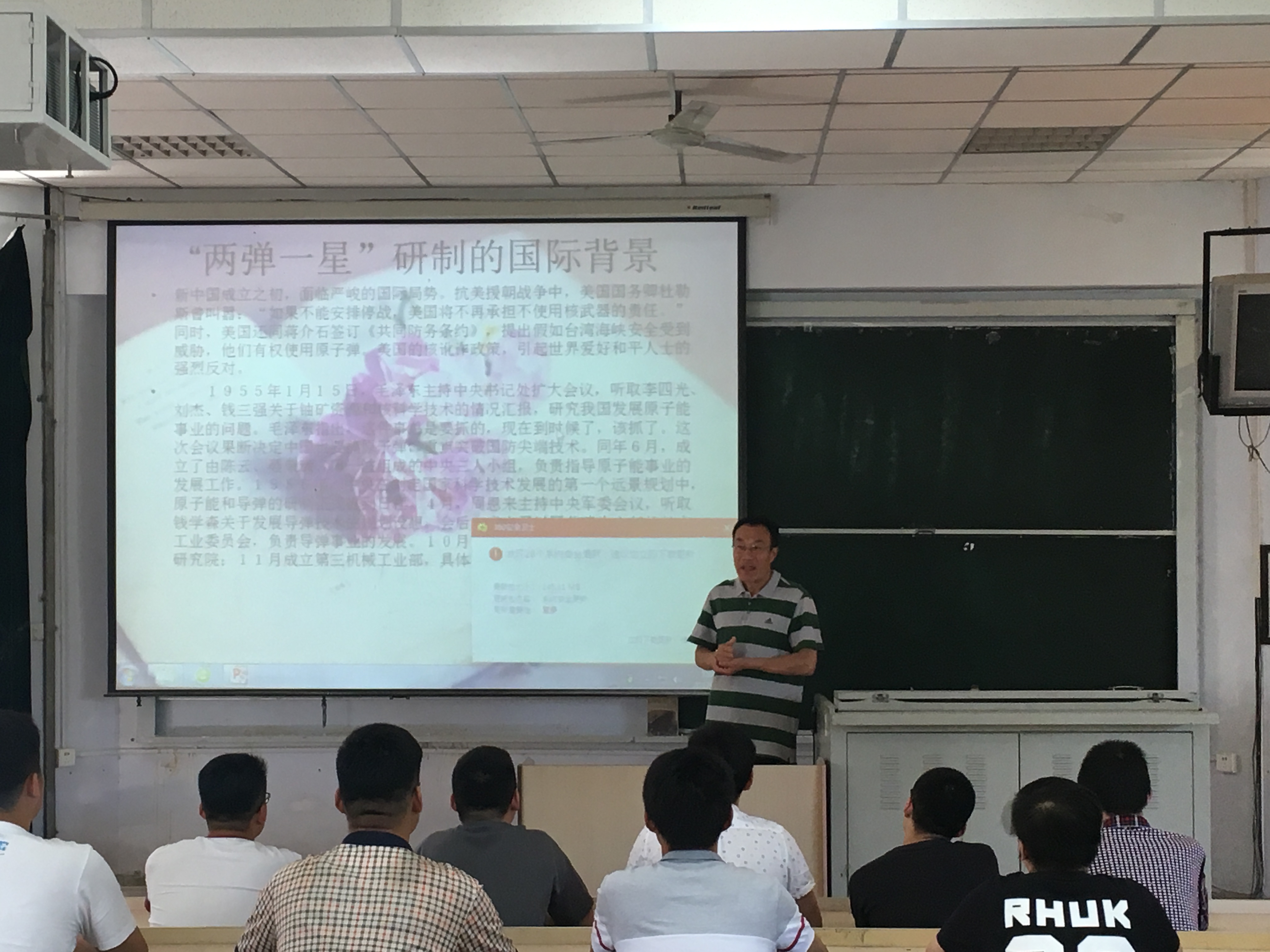 为弘扬“两弹一星”精神,培养学生的爱国主义、集体主义、社会主义精神和科学精神,提升科技创新意识,物理与光电工程学院于2017年5月25日在明正楼5210教室由党总支副书记贺志波讲述“两弹一星”——中国共产党困难时期的科技突围的党的故事。物电学院学生骨干听了贺老师的讲述。