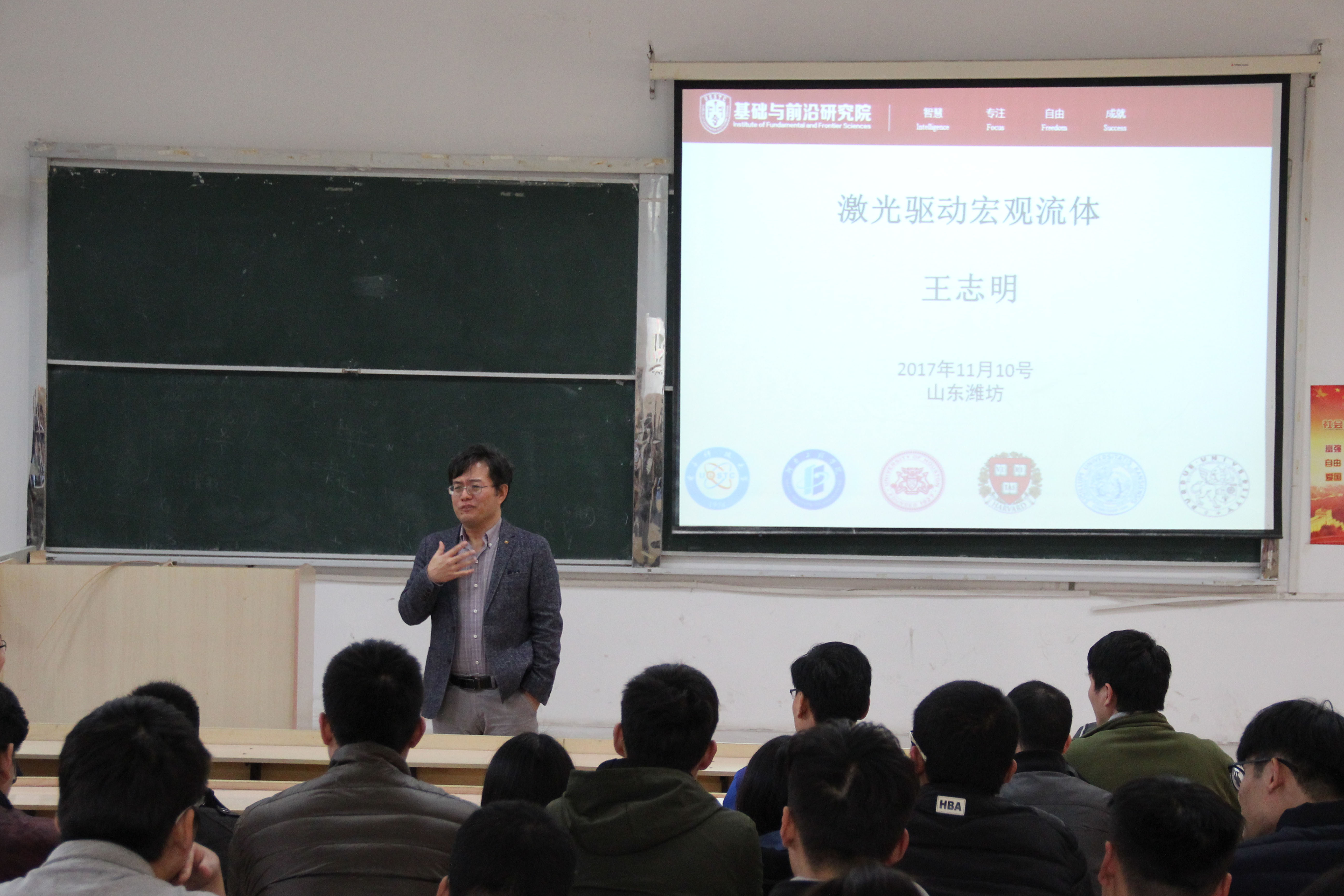 物电学院为拓展学生视野,增强学生对所学专业的了解,2017年11月10日,电子科技大学基础院与前沿院执行院长王志明教授在5109教室为物电学子带来了一场题为《从激光驱动宏观流体谈起》的学术讲座。物理光电工程学院院长李英德、王俊宝等老师以及15级物理学,15、16、17级光电专业的同学聆听了本次报告会。