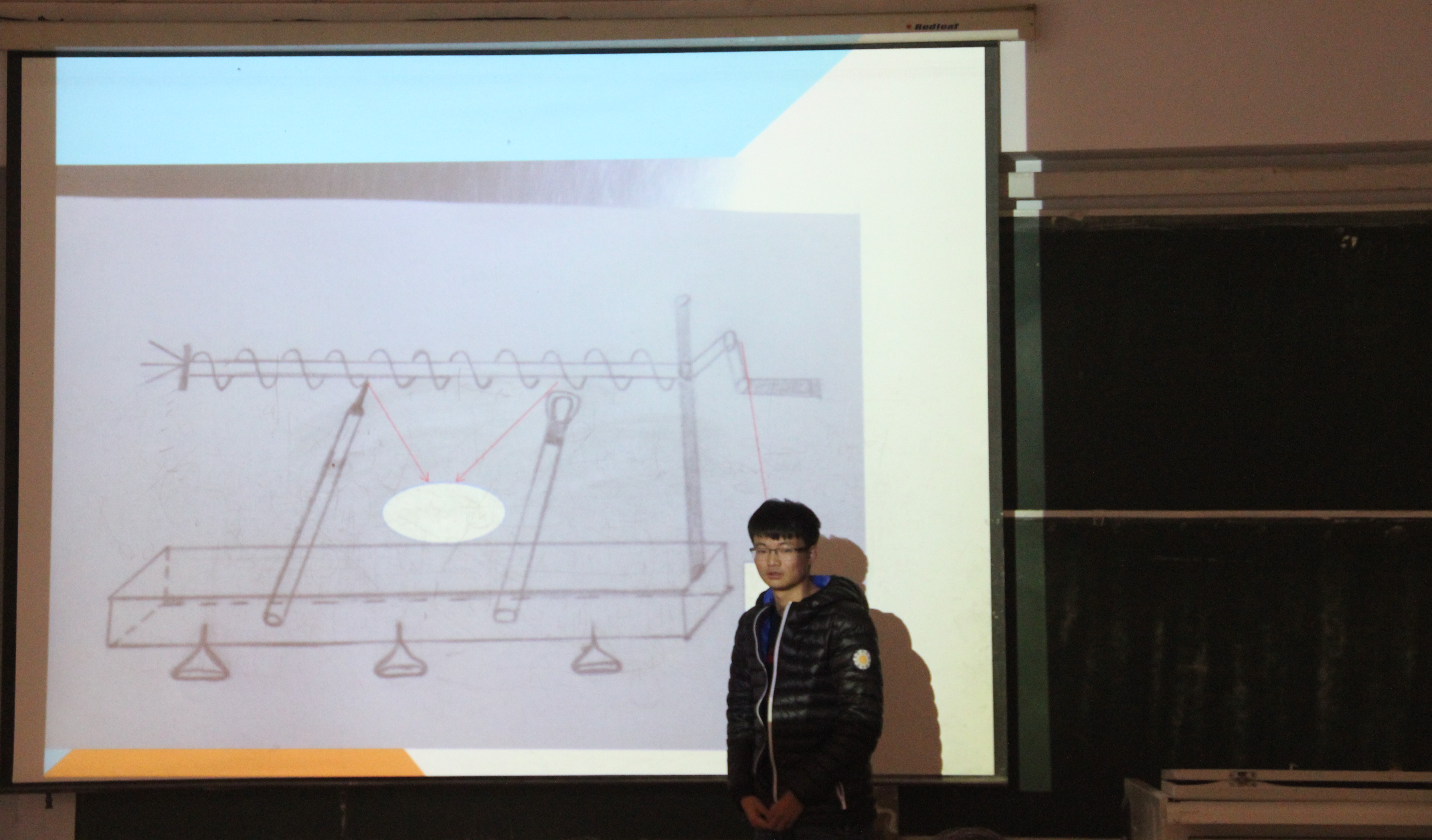 本次大赛旨在鼓励、引导、支持大一新生积极参与科技创新活动,培养学生们的创新精神,发现和培育有创新潜力和研究能力的优秀新生。我院共八个小组参加比赛,下午15:30,比赛在观众热烈的掌声中拉开了帷幕。各小组代表依次走上讲台进行作品展示,他们用逻辑严谨、思路清晰地宣讲着自己参赛作品的构造和用途,之后的答辩环节,老师和评委都会提出一些问题来考察选手的知识储备和应变能力,也会点评作品的优缺点,并给他们的改进建议供选手们参考。