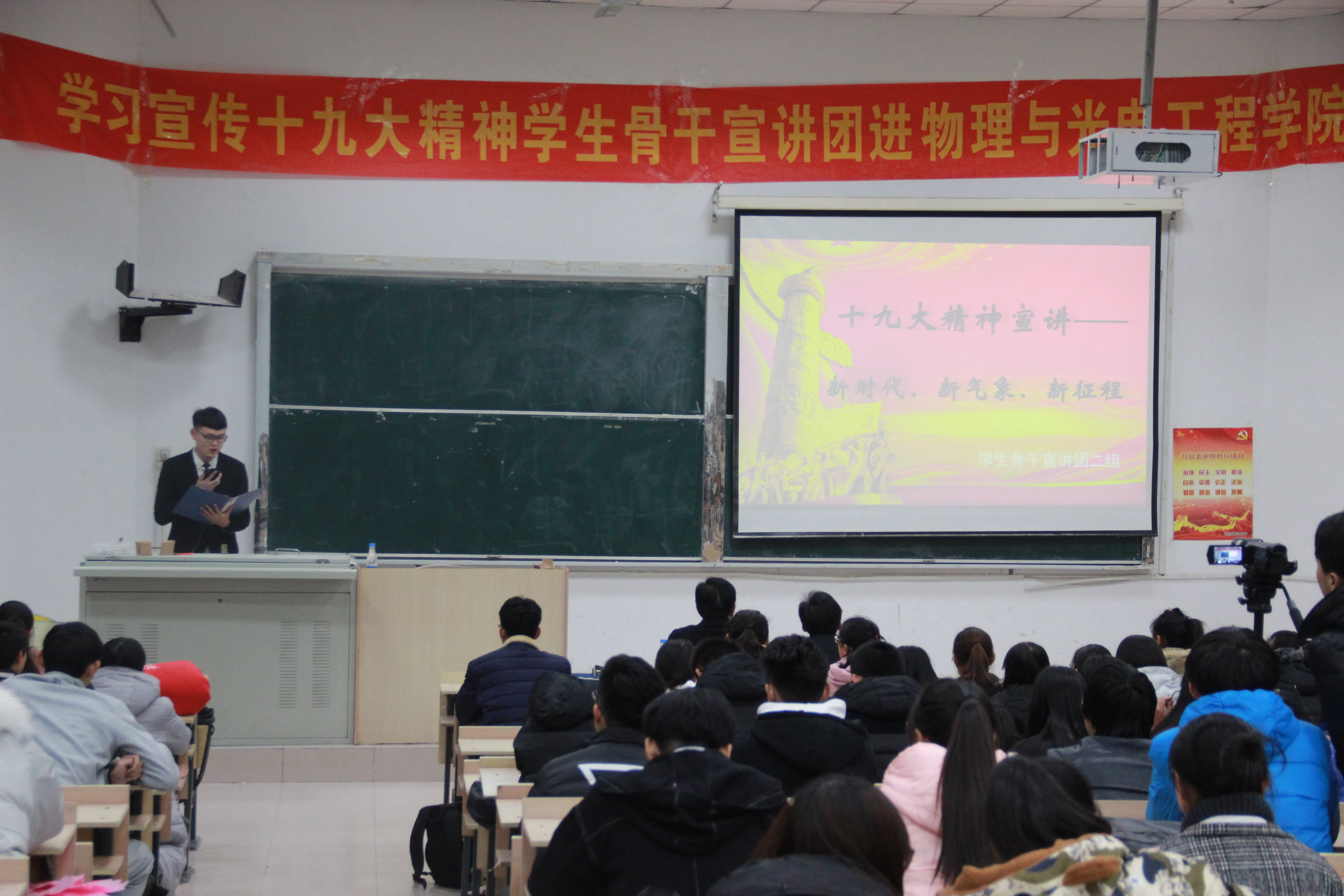 为进一步在青年学生中开展党的十九大精神的学习宣传活动,发挥学生党员和学生骨干的典型示范和引领作用,学生工作处组建了学生骨干学习宣传十九大精神宣讲团并于近期在全校范围内进行巡回宣讲。2017年11月30日,物理与光电工程学院特组织2017级全体学生在五号楼5109教室聆听了此次宣讲,物电学院党总支副书记贺志波、学生工作处副处长张增森也莅临现场,陪同学生共同深入学习十九大精神。