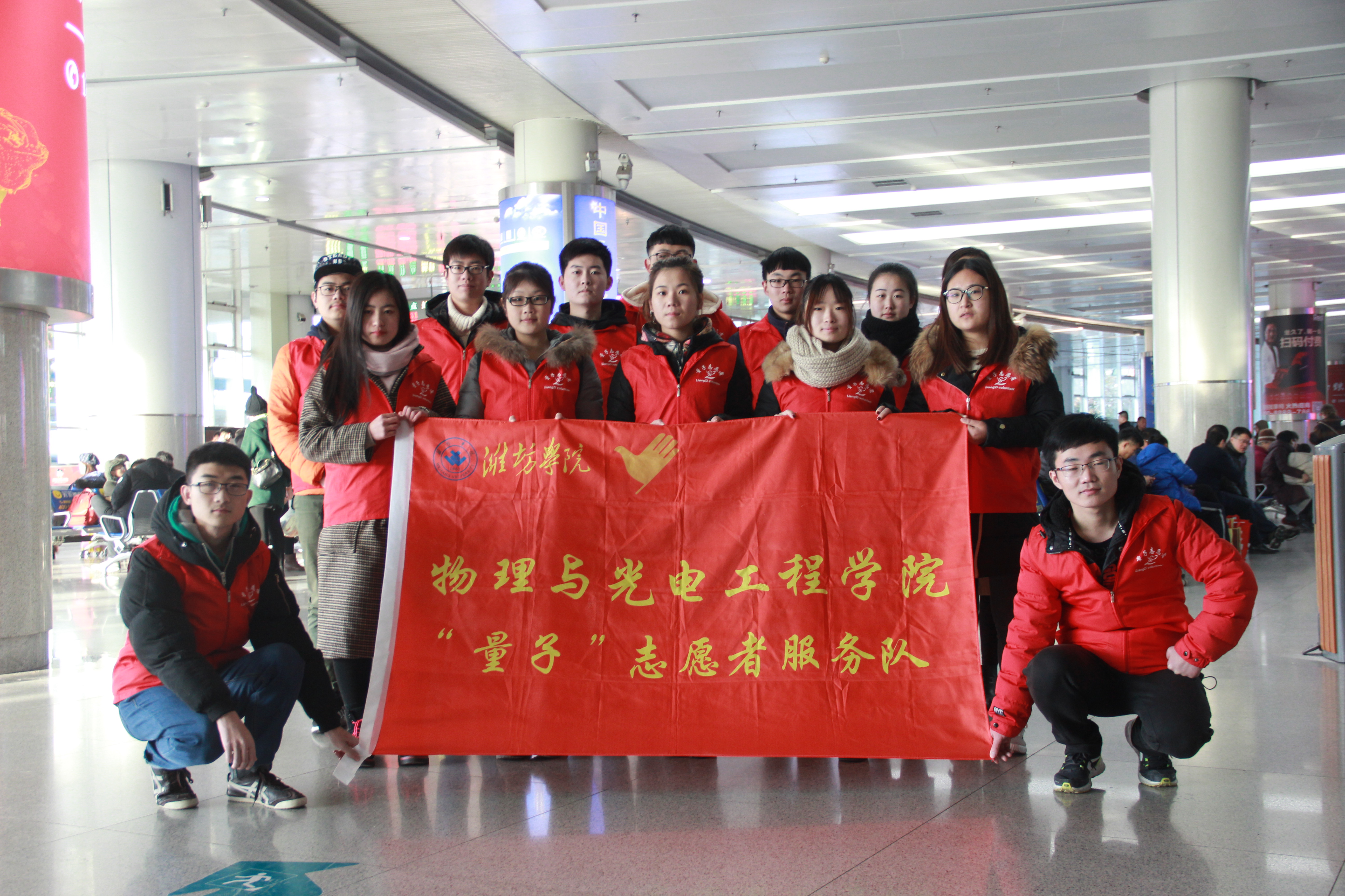 为了促进学生党员深入学习十九大精神。2017年12月9日,物理与光电工程学院的第三个“党员服务日”,在物电学院学生会主席牛浩然,副主席赵文铎、刘希、寻思怡四位学生会主席团成员的带领下,物电学院部分学生党员以及部分入党积极分子携手“量子”志愿者服务队共十五人,长途奔袭四十余分钟到达潍坊火车站,开展主题为“学习贯彻十九大精神,做新时代合格党员”的火车站旅客疏导志愿服务活动。