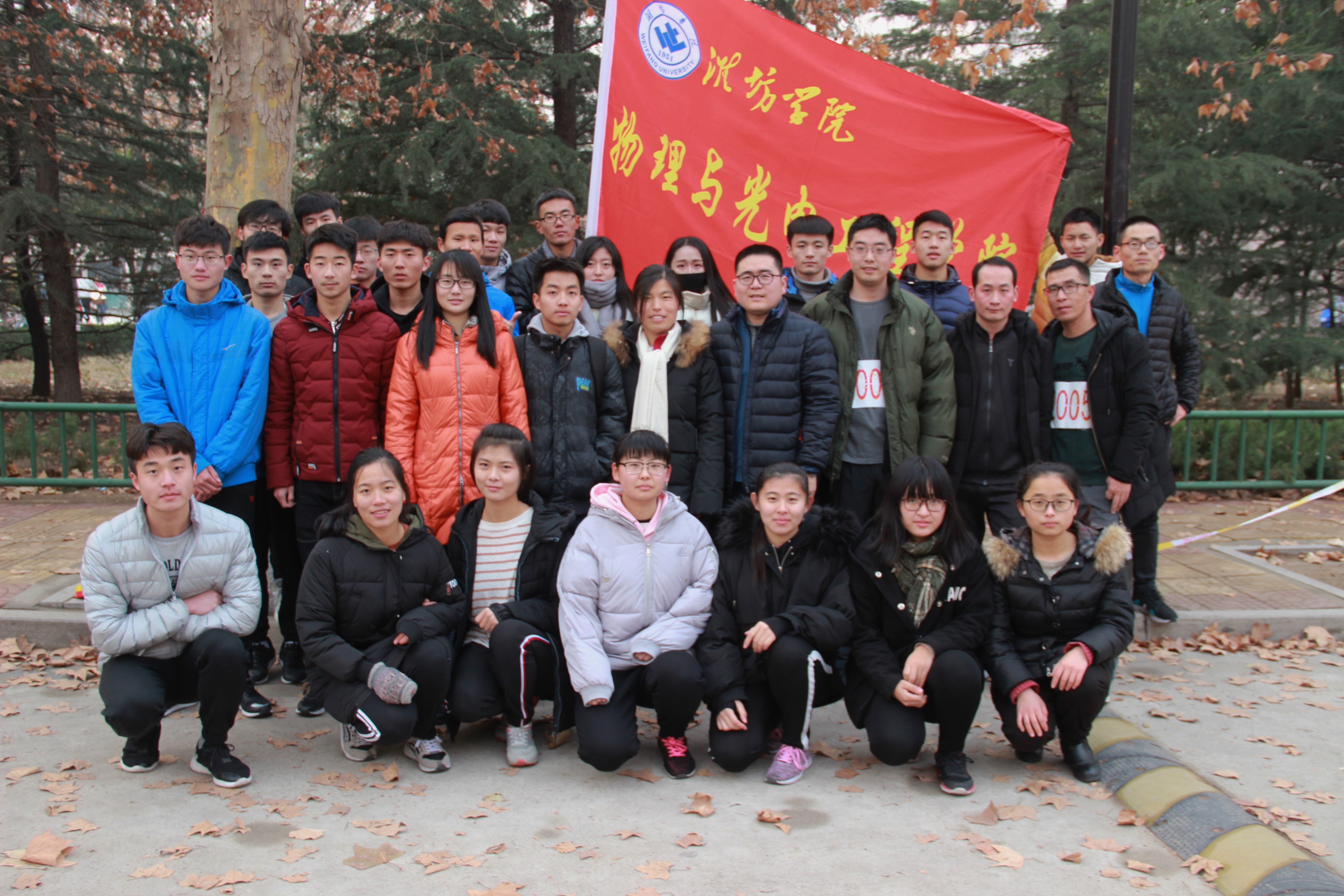 2017年12月15日下午两点,潍坊学院第十七届冬季长跑比赛如期举行,物理与光电工程学院党总支副书记贺志波、副院长赵加强等八名教师组成教工组代表队,2016级、2017级16名同学组成学生组代表队参加了此次比赛。