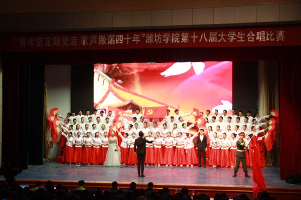 为深入贯彻落实习近平新时代中国特色社会主义思想、党的十九大精神和学校第三次党代会精神,加强校园文化建设,扎实推进思想政治工作。2018年5月24日下午两点四十分,物理与光电工程学院合唱团参加了在图书馆报告厅举行的主题为“青年坚定跟党走,歌声激荡四十年”潍坊学院第十八届大学生合唱比赛。