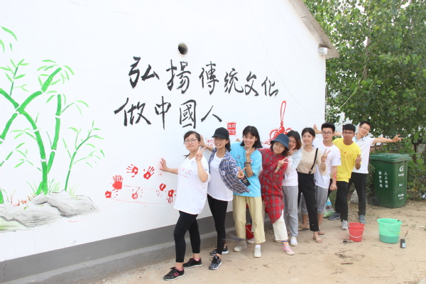 经历了两次的从太阳初升到红日当空,再到日落西山,志愿者从没有一丝的松懈。此时的墙体彩绘也已经初具规模,六面墙体,在传统国学文化的基础上,开阔思路,大胆创新,第一天的小妹妹,让服务队见到了乡村的和谐之美和淳朴之美,以“和谐•家园”为主题的墙体,则融合“仁”“和”等传统汉字元素,表现村庄和谐、淳朴民风,再增添“荷叶”“荷花”等元素,寓祝家庭团团圆圆、村庄圣洁不受沾染,进一步将国学文化与现代文化相结合,为村民呈现更通俗易懂的国学文化。