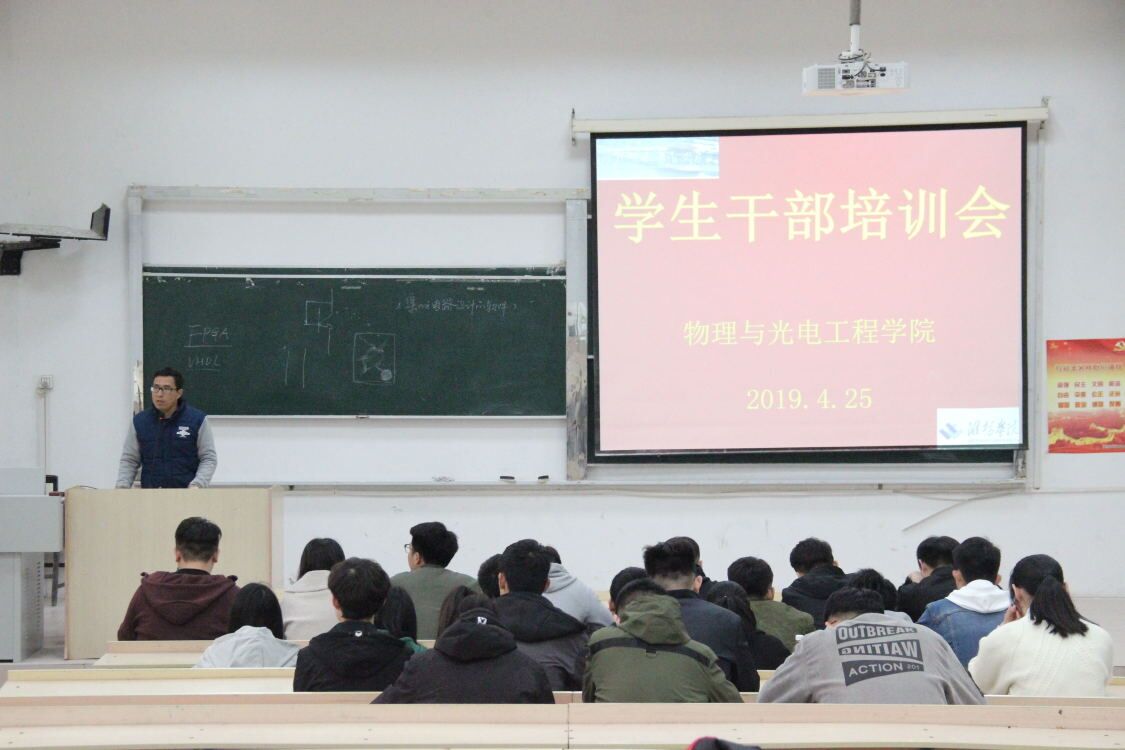 为加强学生干部日常管理和培养、提升综合素质和能力,更好服务广大同学,物理与光电工程学院于2019年4月25日在明正楼5109召开学生干部培训会。党总支副科级组织员金波昌、团总支副书记王振国两位老师讲授,学生会主席团、部长级成员以及大一到大四各班班长和团支书参加了此次会议。