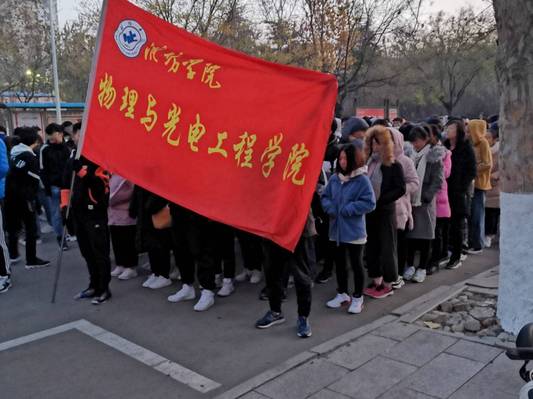 为丰富校园文化,帮助同学们养成良好的健康意识,促进同学们之间的情感交流,推动形成全民健身新浪潮,2019年11月28日,物理与光电工程学院组织部分同学于学院外环路参加“奔跑吧,潍院”主题冬季晨跑活动。