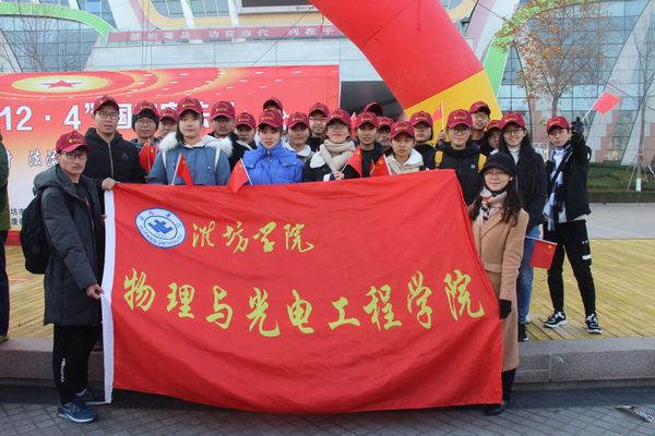 为宣传宪法知识,弘扬宪法精神,在全社会树立起懂法、尊法、守法的良好氛围,2019年12月4日,由中共潍坊市委宣传部、 中共潍坊市委全面依法治市委员会办公室、潍坊市司法局等多部门联合举办的“12•4”国家宪法日“运动健身,法制兴潍”万人徒步宪法主题宣传活动在潍坊市人民广场举行,潍坊学院物理与光电工程学院20名学生在学院副科级组织员金波昌老师带领下参加了本次活动。