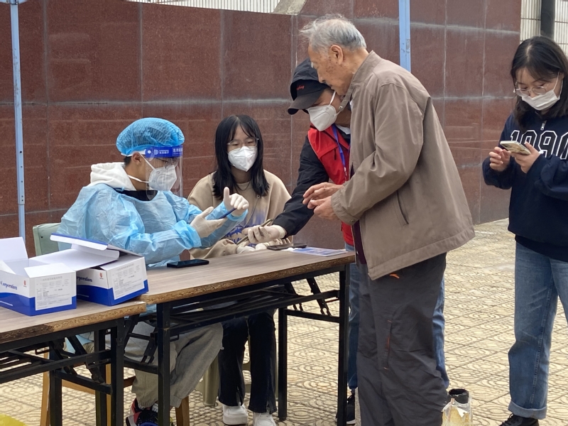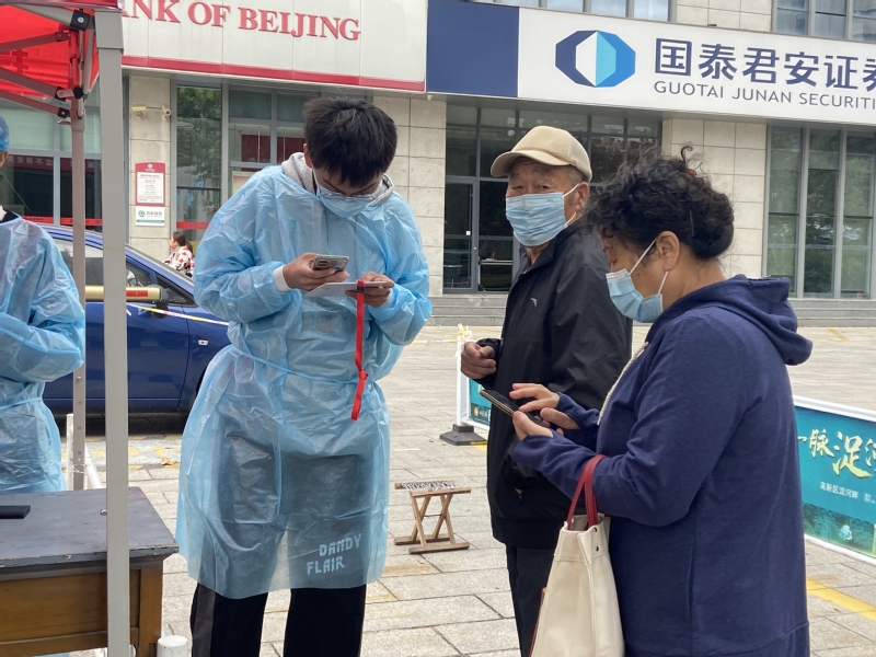 在核酸采样现场,志愿者一边引导居民有序排队进入核酸检测采集区,一边告知居民相关注意事项。有的居民群众抱怨排队时间长,志愿者就第一时间上前安抚他们的情绪;有些老年人不清楚如何使用智能手机进行扫码注册,志愿者们就耐心讲解并帮他们完成注册。从下午2点到晚上6点,五个志愿小组积极参与到维护现场秩序、测温查码、信息填报、问询指引等一系列工作中去,全力协助医护人员和工作人员,以实际行动确保社区全员核酸检测任务顺利完成。