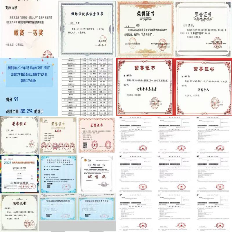 志愿服务是刘源大学生活中另一抹亮色。他的足迹遍布乡村、校园与潍坊社区:在“三下乡”社会实践中,他是给乡村孩子讲科技的 “小老师”;在校园中,他是“考研护航”“迎新引导”等活动志愿者,累计服务时长超200小时;在社区中,他定期帮助老人学习使用智能设备、普及防诈骗知识,还多次参与社区清洁、养老院慰问等活动。正因这份坚持与担当,他先后获评“校级三下乡优秀个人”“校级优秀青年志愿者”以及“山东省志愿服务高质量发展社会调查活动优秀调查员”等荣誉。深入基层的经历,让他学会了“共情”,也更坚定了青年服务社会的责任与担当。